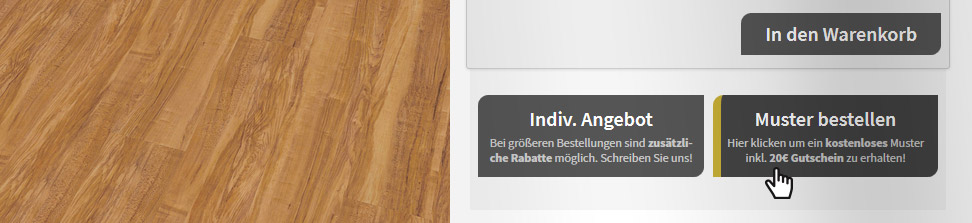 Natürlich möchten Sie Ihren neuen Fußboden vor dem Kauf gründlich begutachten. Dafür bieten wir Ihnen einen besonderen Service: Wir schicken Ihnen bis zu 6 kostenlose Muster nach Hause! So müssen Sie sich nicht auf Fotos oder das Licht im Geschäft verlassen, sondern können Ihren Lieblingsboden bereits vor dem Kauf in Ihrem eigenen Zuhause ansehen. Als Dankeschön erhalten Sie zusätzlich einen Gutschein über 20€* für Ihre Bestellung! Das geht ganz einfach in 3 Schritten: